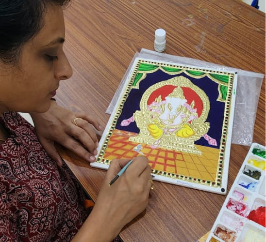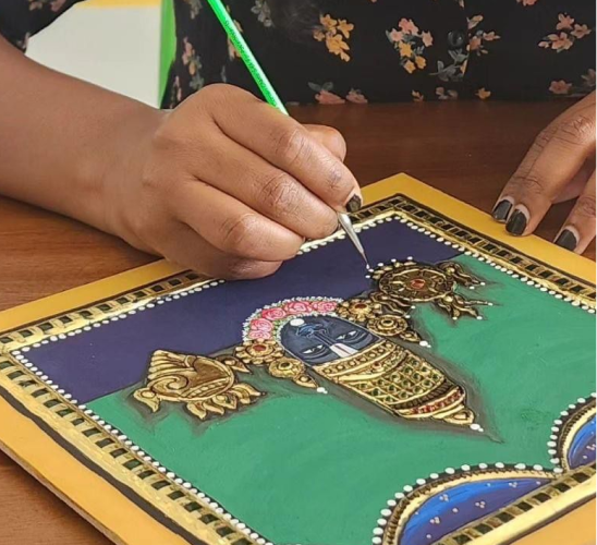 Artists created their masterpieces on board, cloth, and specially prepared paper using colors crafted indigenously from minerals, leaves, and flowers. Notably remarkable is their expert skill in utilizing gold – be it leaves or foil – alongside gesso work to add an extravagant touch to their creations. The techniques employed by Mysore artists are unique when compared to those prevalent in Tanjore. In essence, the Mysore style of traditional painting seamlessly integrates ancient influences with artistic innovation, resulting in visually stunning works that continue to captivate audiences worldwide.