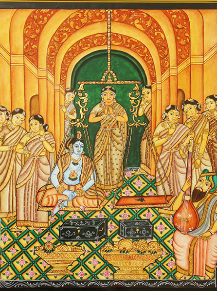 The Mysore style of traditional art, originating from the Ajanta and Badami caves in the early centuries A.D., reached its pinnacle during the Vijayanagar era (1347-1746). It gained its distinct identity in Mysore under the patronage of Wodeyar rulers, notably Krishnaraja Wodeyar III (1794-1868). The artwork predominantly revolves around themes derived from epics and mythical legends, captivating a wide audience with its iconographic and narrative depictions. These exquisite paintings adorned palace pavilions, opulent residences, as well as Bhajana-mandiras where common folk congregated.