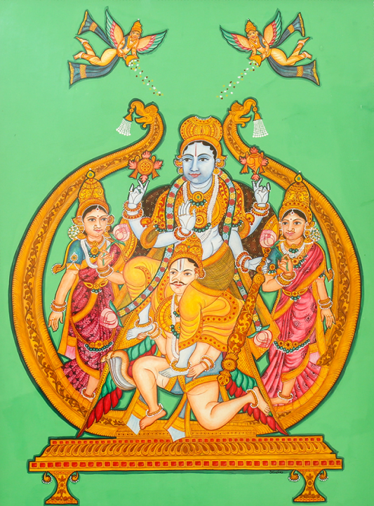 The processional icon of Sampathkumara mounted on Garuda (Garudotsava) is the theme of this excellent painting. The composition inspires admiration. The green background is very effective that goes into the encircled iconic representation of the form of Vishnu that the Wodeyar family is devoted to. The figures are very neatly drawn, the colours are soft and sober.